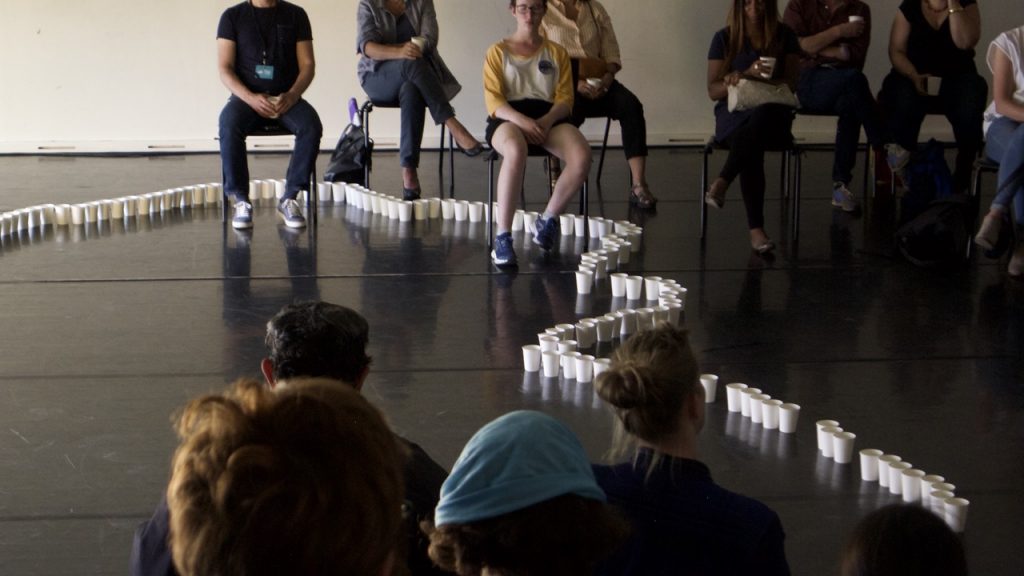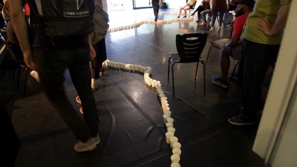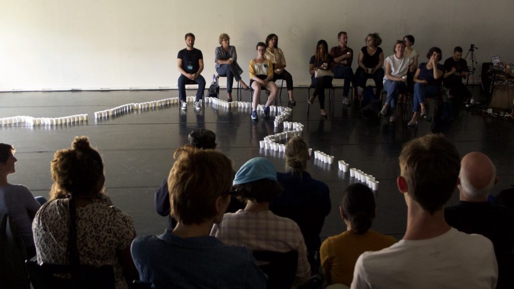 Une bâche prolongeant celle de la scénographie du spectacle filmé, est déployée au pied de la projection et devient l’espace de la théâtralité en direct.