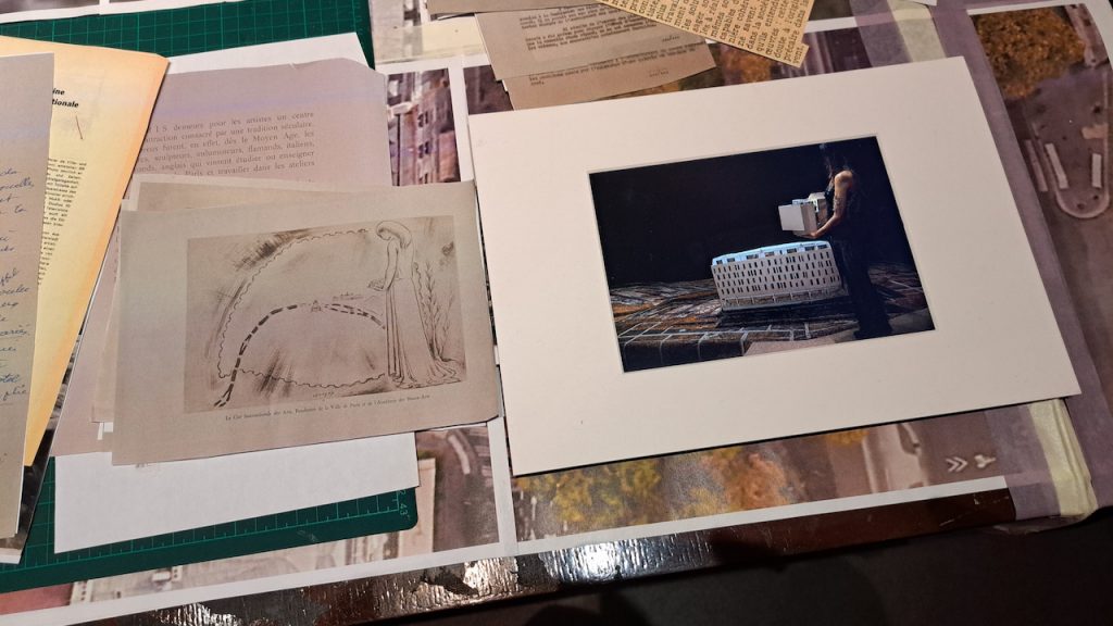 Dans le cadre architectural brutaliste de la Cité internationale des arts, l’artiste reconfigure la Grande Galerie non plus comme un simple espace d’exposition, mais comme un lieu potentiel d’accueil. Observant les campements qui apparaissent chaque nuit devant la Cité internationale des arts, et s’appuyant sur des recherches archivistiques, l’artiste propose un autre usage de la Galerie : un programme architectural qui intègre le regard et la vulnérabilité de l’étranger comme paramètres de conception.