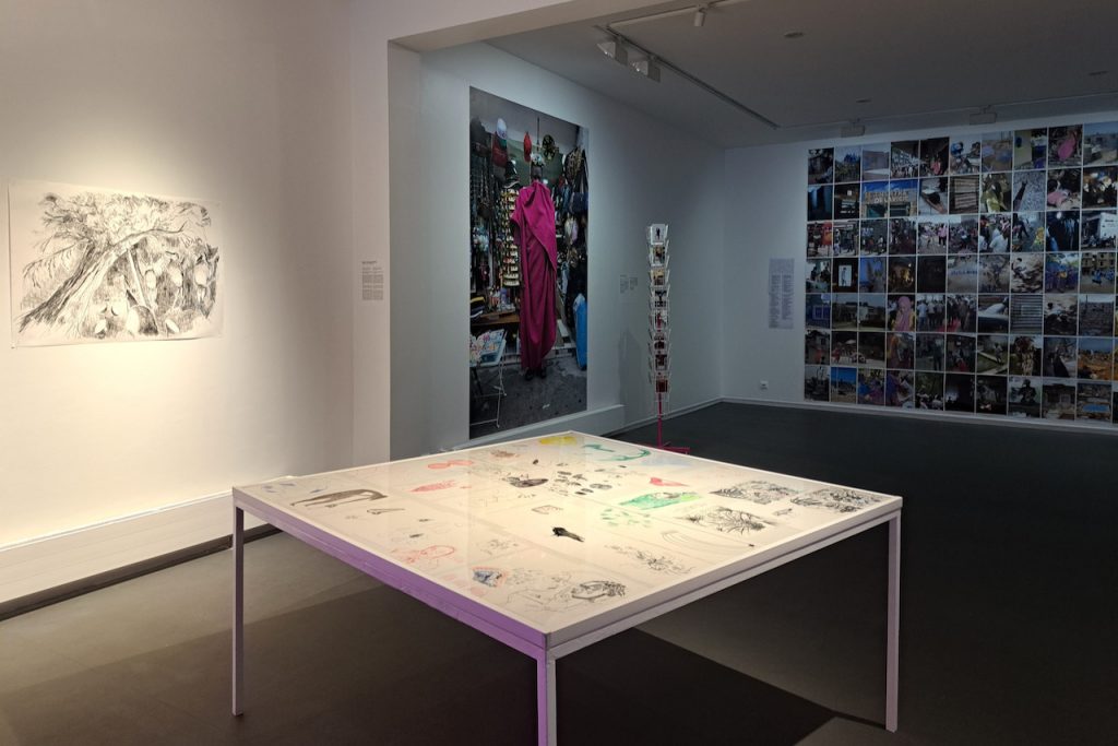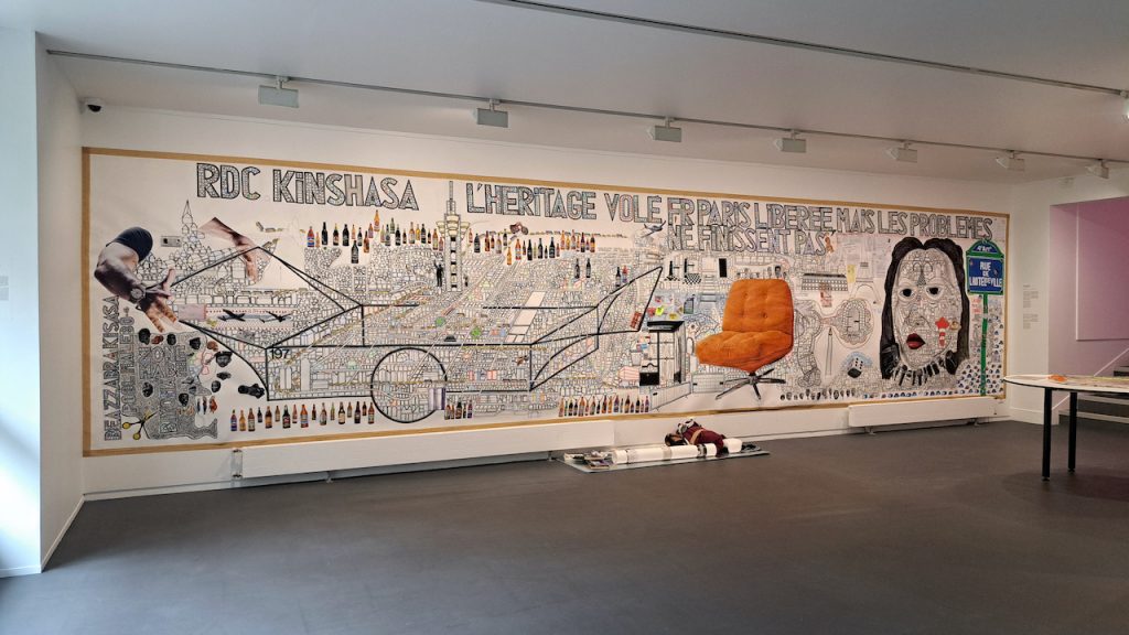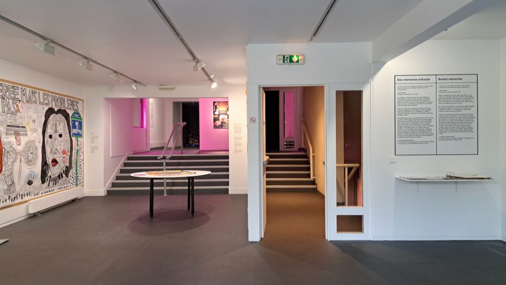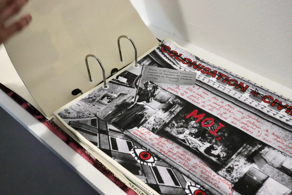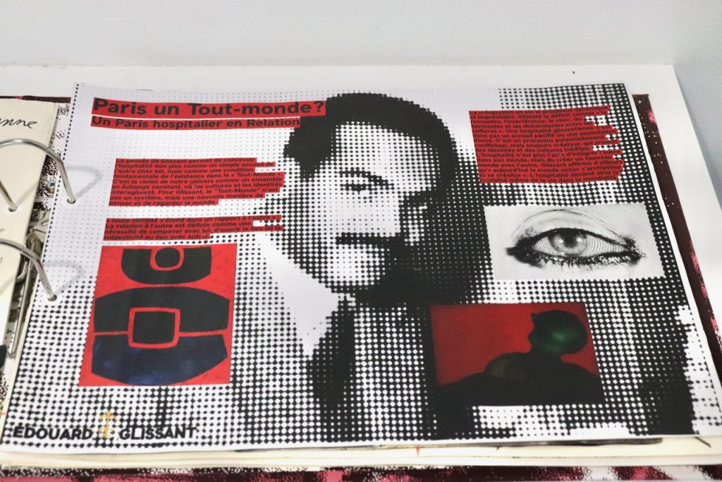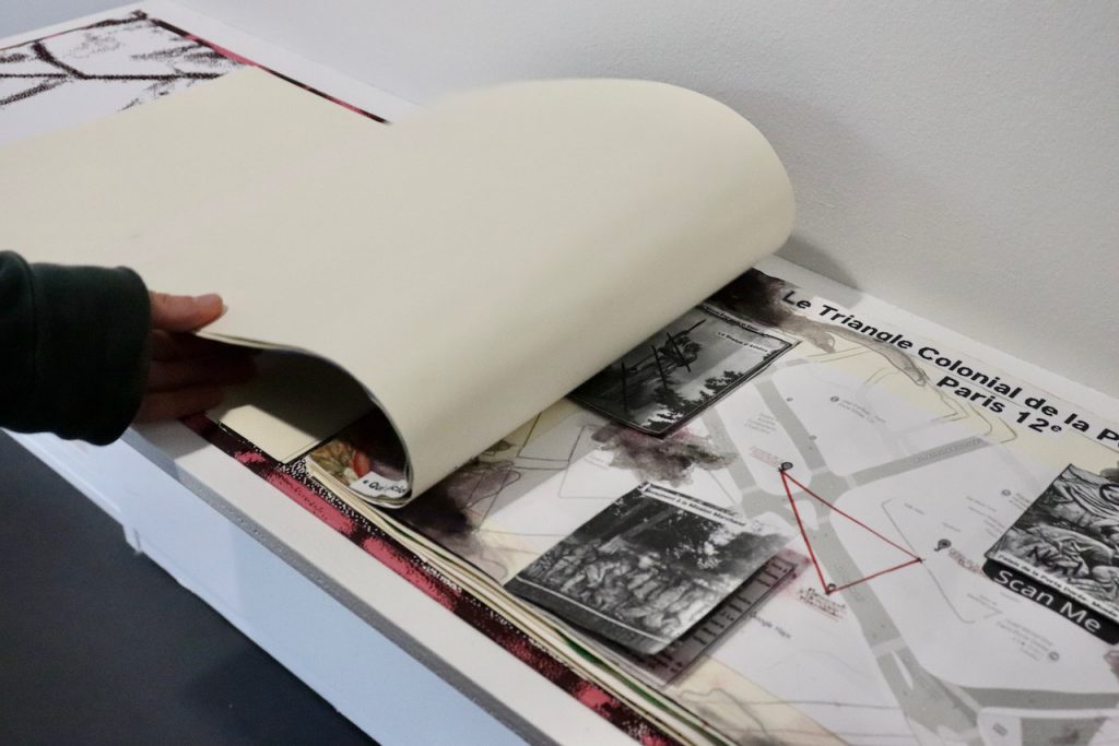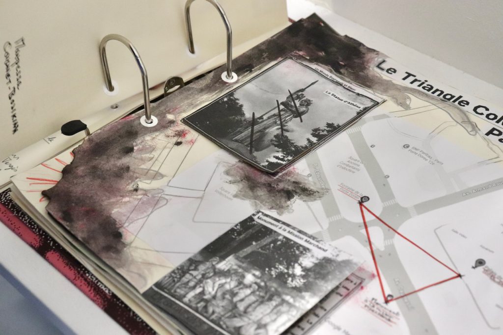 Lotte Arndt, chercheuse et professeur en histoire des mondes modernes à la Sorbonne, a proposé à une centaine d’étudiant.es de réaliser une recherche sur les traces coloniales encore présentes à Paris. Chaque étudiant.e a produit une planche A3, l’ensemble est collecté dans un classeur au titre de « Fissures urbaines » présenté en salle 4 sous le texte de salle « Mémoires enfouies »