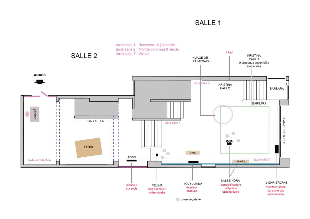 « j’aimerais” : chacune et chacun se projette dans un rêve, dans un souhait, un vœu, un changement, une réalité de l’accueil à Paris. Les réponses sont suspendues comme un nuage au centre de l’espace de rencontre. »