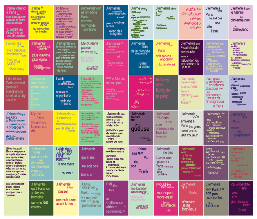 « Comment continuer à concevoir la ville comme un “monde commun” ? Paris a toujours été constitué par la cohabitation et les trajectoires de gens venus de partout, traversés par des réalités de vie, des temporalités, des pratiques et des imaginaires. Vivre ensemble implique inventer les seuils qui donnent sens à l’acte de passer d’un espace à un autre.