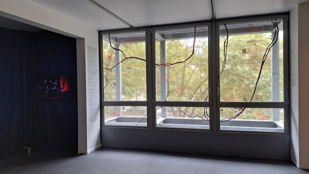 The map, created in situ, is taken from his latest work and specifically from his research on the multiplicity of places and times of the colonial massacre of October 17, 1961, in Paris. The work was conceived in relation to the window of the Cité internationale des arts overlooking the Seine and was inspired by the disturbing question: “How many Algerian workers were missing on the morning of October 18, 1961, at the Cité construction site?” The map was exhibited in Algiers in 2025.