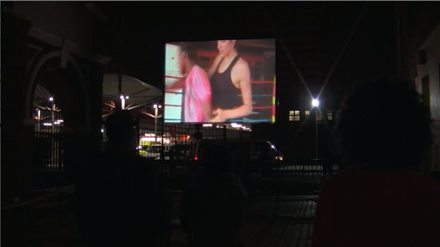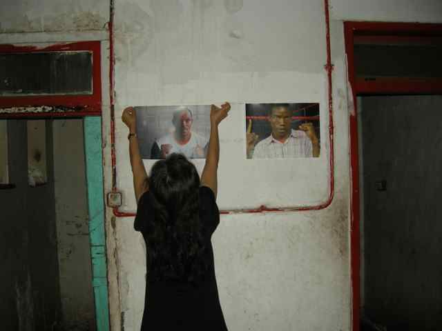 Marie Dominique Dhelsing produced a number of video pieces during the residency, all of which were informed by the site-specific context and encounters with local communities. She worked with students from the Vega design school (at the Drill Hall) as well St. Enda’s College (Joubert Park) on a series of videos in which participants used cellphones to explore their positions and wishes for their environment. She spent extensive time researching and documenting daily interactions and the streets which resulted in a comprehensive diary and hours of footage. This was partly consolidated into video works that were presented at a DVD stall at Noord Street Market and in a hair-salon at the Drill Hall. For example, “In the Ring” or “Battle of Love” was produced in collaboration with two dancers, Mbuso Kgarebe and Fanny Skura at George’s Boxing Gym on Claim Street. The video sees the two performers in a dance like fight where neither win or lose. The video was projected during the festival on a large screen in the street at the Drill Hall, as well as in a local hair-salon. See also: http://blogs.arte.tv/villes-monde. Dhelsing worked closely with her assistant Quaz Roodt.