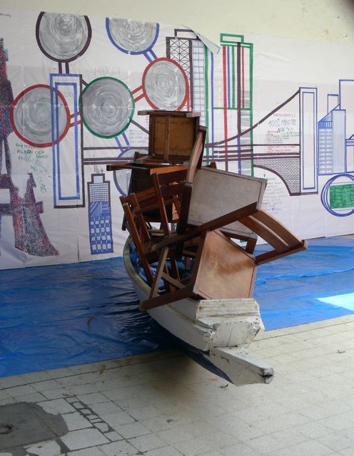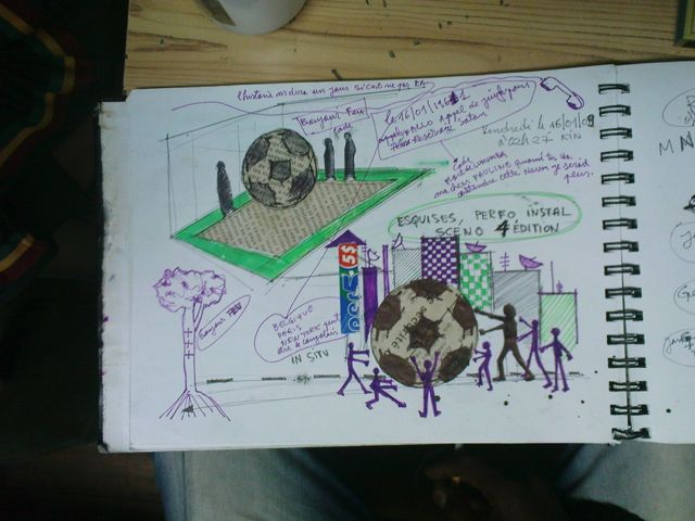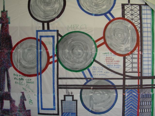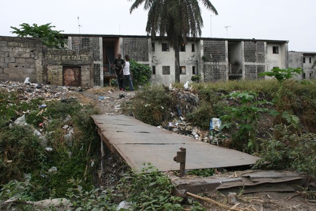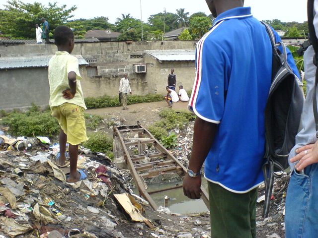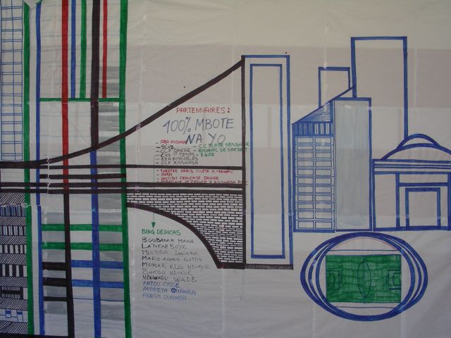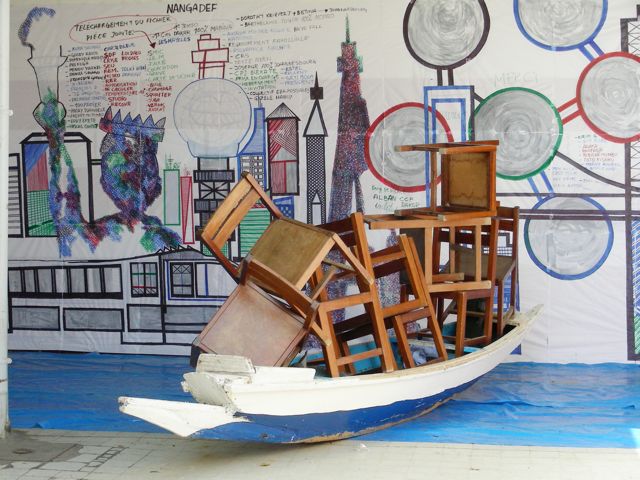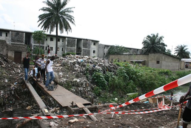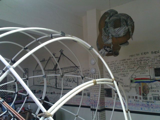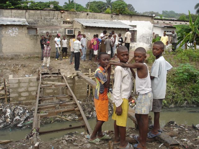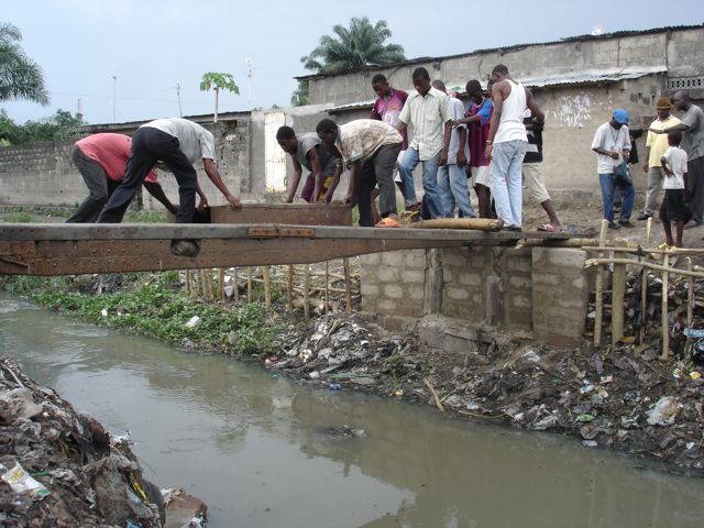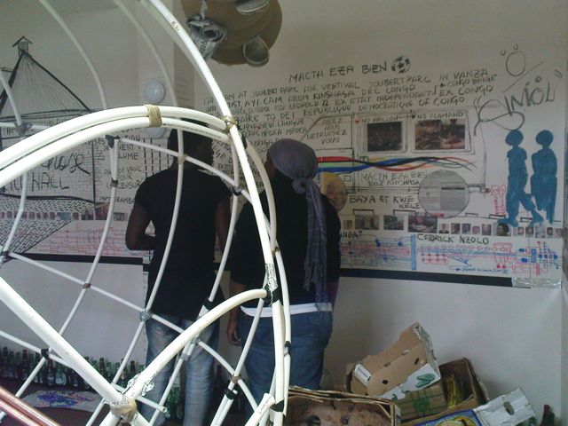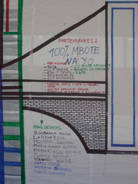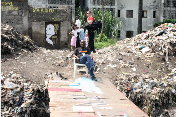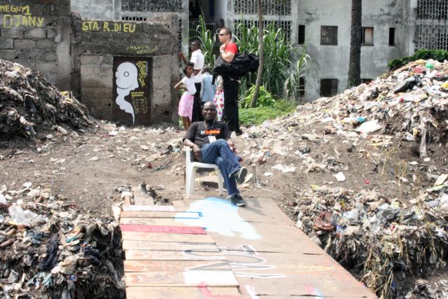 Mega fait partie du collectif Eza possibles et a beaucoup œuvré avant et pendant la résidence aux relations avec les habitants et relais du quartier. Mega s’est emparé du problème d’un pont inachevé pour en faire un acte d’artiste. Les gens devaient faire un détour car ce pont, le long de l’avenue Attente au dessus de la rivière de la Gombé, commencé sur les fonds propres d’un notable du quartier, n’avancait pas faute de fonds. Mega aidé par Eddy Ekete et les habitants ont achevé le pont. En même temps ils ont « recyclé » une partie des déchets environnants (une montagne), sous la forme d’une installation de chaussures usagées. Lorsque les officiels de l’ambassade de France sont venus visiter le site, Mega les attendait assis sur une chaise au milieu du pont. Il y a ici une manière de s’emparer de la réalité matérielle dans toutes ses composantes et de s’en servir pour poser des actes d’artistes qui fassent sens, qui est au coeur du projet des scénographies urbaines. La construction du pont a été très suivie et unanimement saluée par les habitants du quartier. // Mega is member of Eza Possibles and he made a lot before and during the residency, for the relationships with inhabitants of the area. He took over the problem of an unfinished bridge to turn it into an artist action. People had to walk a long curve because this bridge, along the Attente avenue and upon the Gombé river, which had been started with the personnal funds of a notable of the area, whas not going on because of lack of fundings. Mega, with the support of Eddy Ekete and of inhabitants, ended the bridge. At the same time, the have « recycled » part of the rubishes which were all around (a mountain), into an installation of old shoes. When the official persons from the Frensh embassy came to visit the site, Mega was waiting them, sitting on a chair in the middle of the bridge. Here, there is a way to seize the material reality in all its components and use them into artists actions, meaningfull. This is the heart of Urban Sceno. The construction of the bridge was a great success.