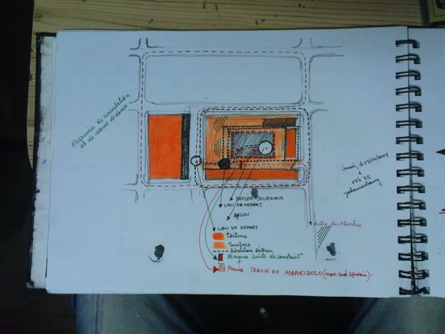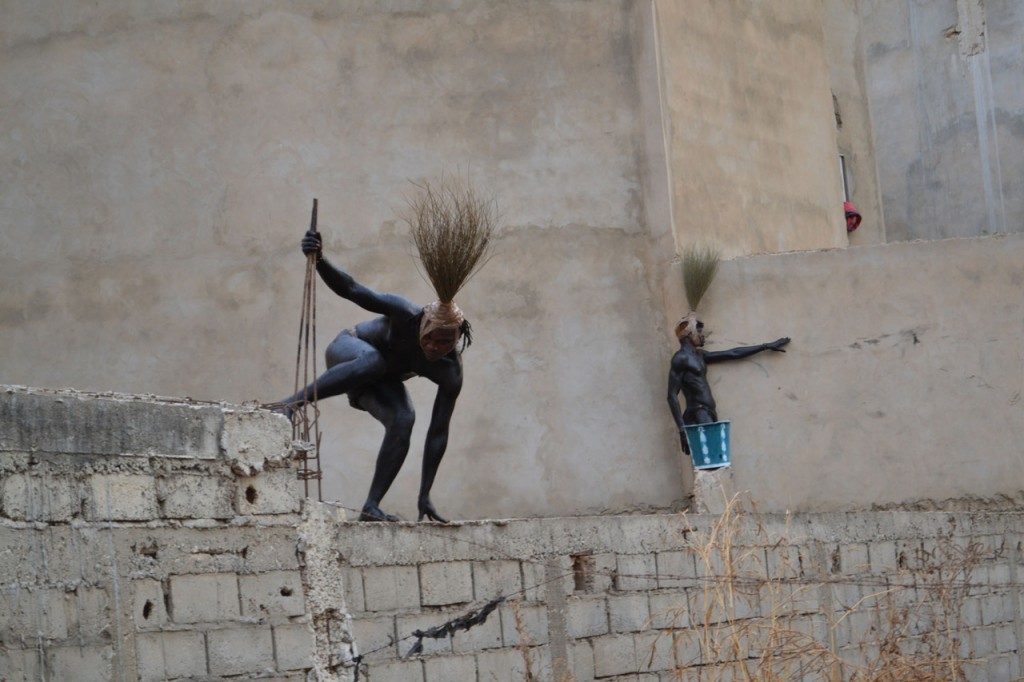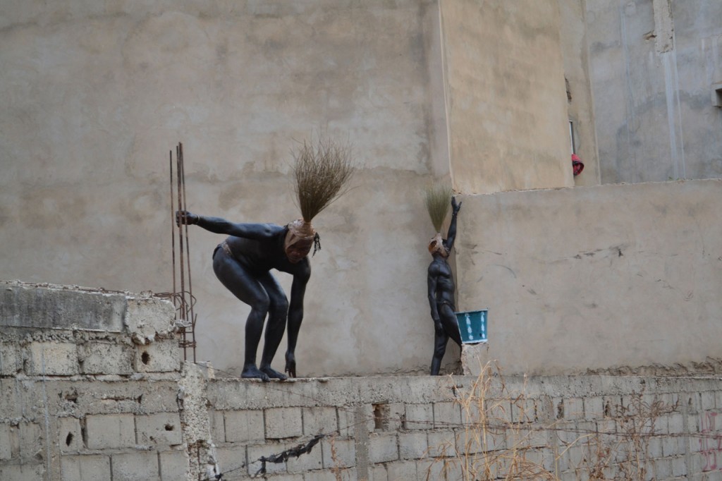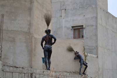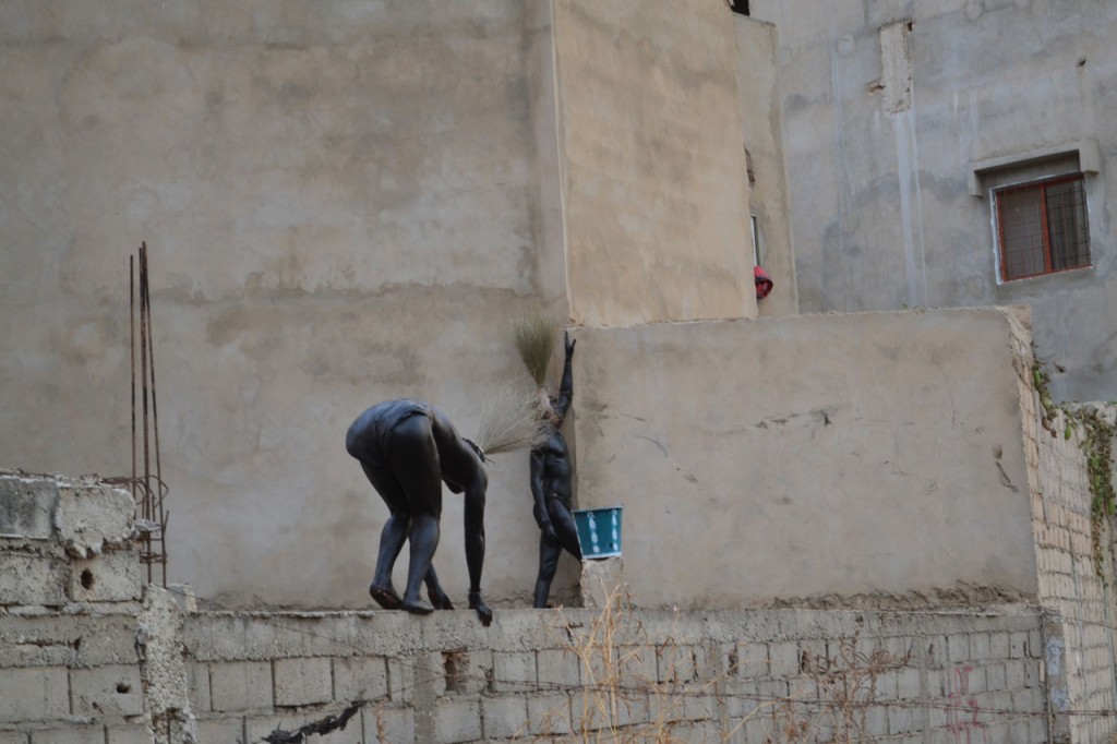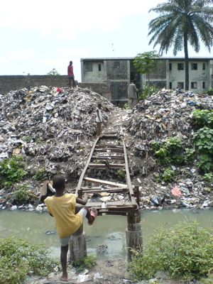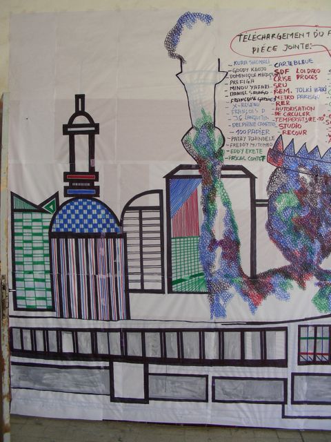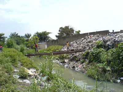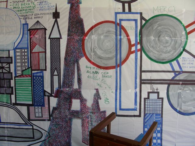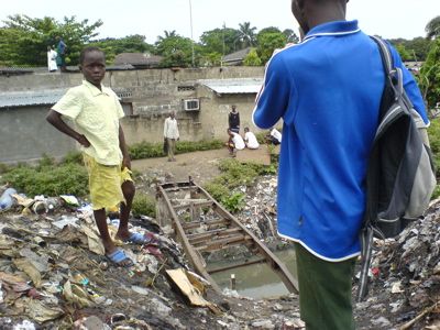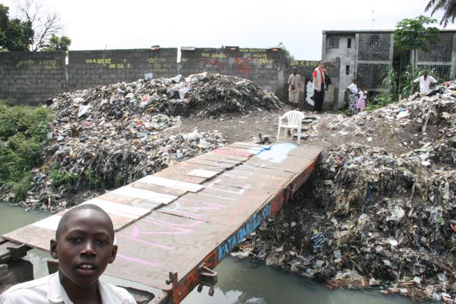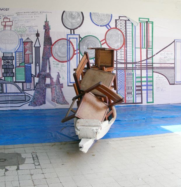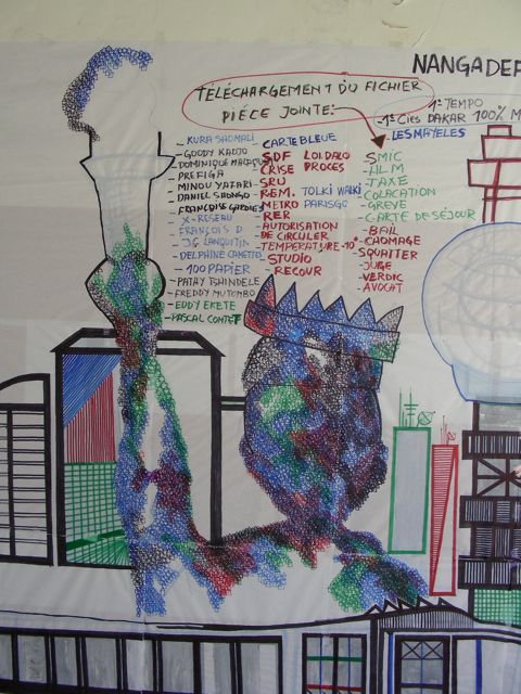 Mega fait partie du collectif Eza possibles et a beaucoup œuvré avant et pendant la résidence aux relations avec les habitants et relais du quartier. Mega s’est emparé du problème d’un pont inachevé pour en faire un acte d’artiste. Les gens devaient faire un détour car ce pont, le long de l’avenue Attente au dessus de la rivière de la Gombé, commencé sur les fonds propres d’un notable du quartier, n’avancait pas faute de fonds. Mega aidé par Eddy Ekete et les habitants ont achevé le pont. En même temps ils ont « recyclé » une partie des déchets environnants (une montagne), sous la forme d’une installation de chaussures usagées. Lorsque les officiels de l’ambassade de France sont venus visiter le site, Mega les attendait assis sur une chaise au milieu du pont. Il y a ici une manière de s’emparer de la réalité matérielle dans toutes ses composantes et de s’en servir pour poser des actes d’artistes qui fassent sens, qui est au coeur du projet des scénographies urbaines. La construction du pont a été très suivie et unanimement saluée par les habitants du quartier. // Mega is member of Eza Possibles and he made a lot before and during the residency, for the relationships with inhabitants of the area. He took over the problem of an unfinished bridge to turn it into an artist action. People had to walk a long curve because this bridge, along the Attente avenue and upon the Gombé river, which had been started with the personnal funds of a notable of the area, whas not going on because of lack of fundings. Mega, with the support of Eddy Ekete and of inhabitants, ended the bridge. At the same time, the have « recycled » part of the rubishes which were all around (a mountain), into an installation of old shoes. When the official persons from the Frensh embassy came to visit the site, Mega was waiting them, sitting on a chair in the middle of the bridge. Here, there is a way to seize the material reality in all its components and use them into artists actions, meaningfull. This is the heart of Urban Sceno. The construction of the bridge was a great success.