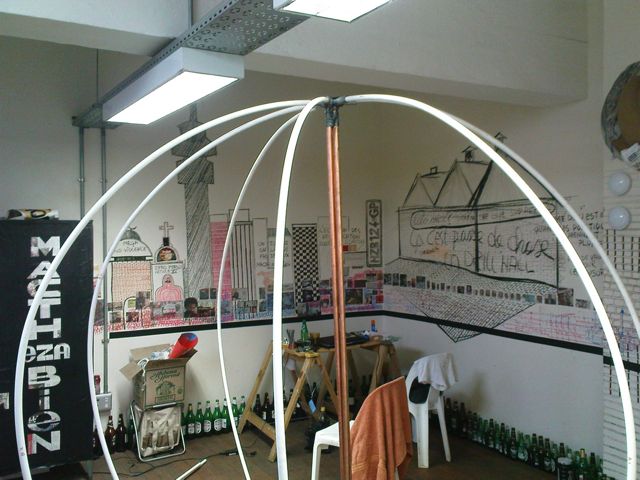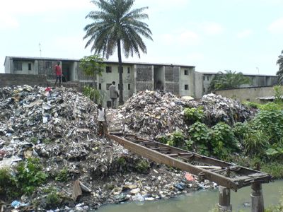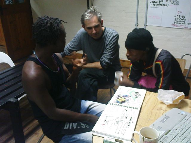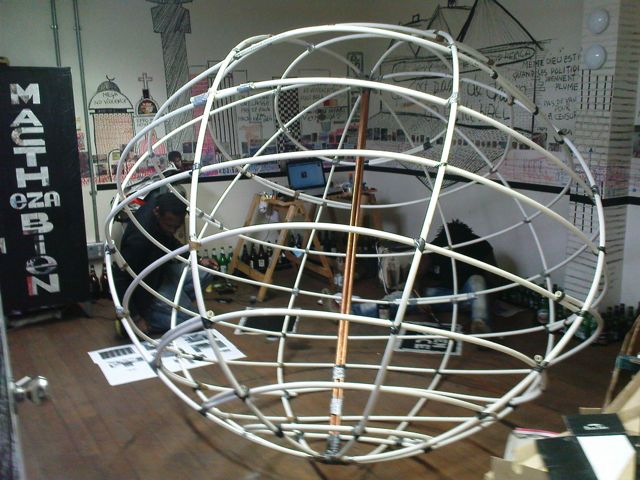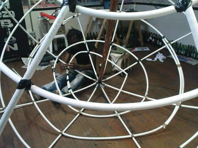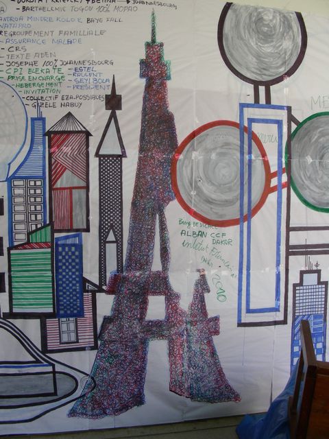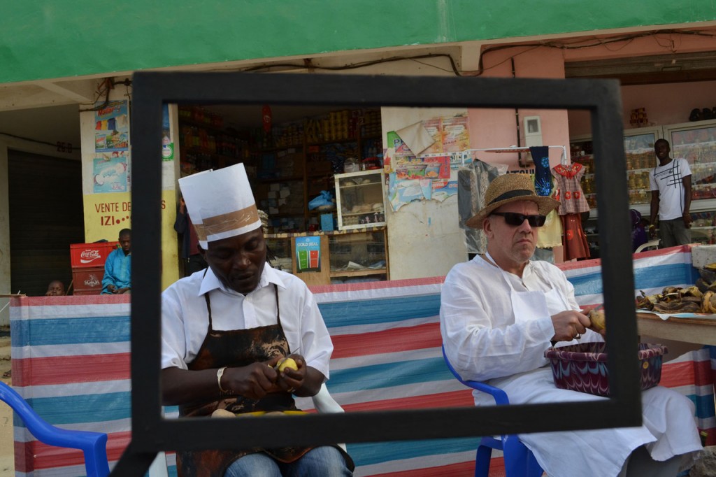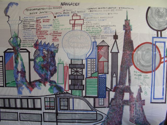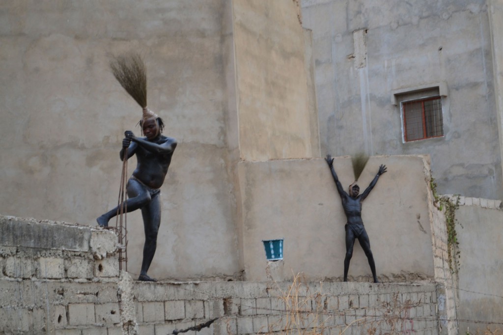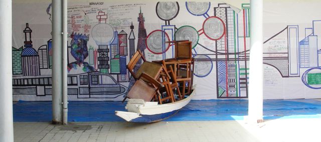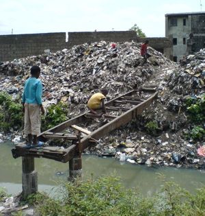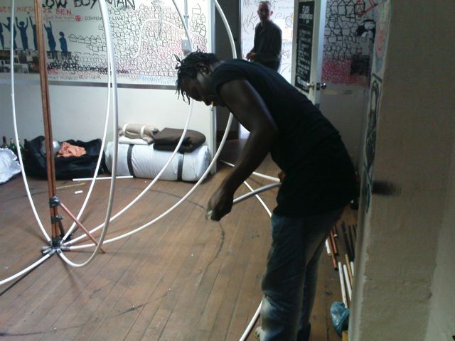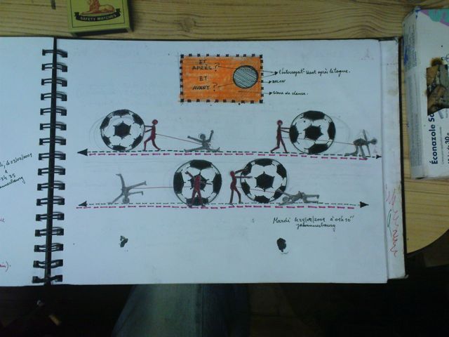 Mega fait partie du collectif Eza possibles et a beaucoup œuvré avant et pendant la résidence aux relations avec les habitants et relais du quartier. Mega s’est emparé du problème d’un pont inachevé pour en faire un acte d’artiste. Les gens devaient faire un détour car ce pont, le long de l’avenue Attente au dessus de la rivière de la Gombé, commencé sur les fonds propres d’un notable du quartier, n’avancait pas faute de fonds. Mega aidé par Eddy Ekete et les habitants ont achevé le pont. En même temps ils ont « recyclé » une partie des déchets environnants (une montagne), sous la forme d’une installation de chaussures usagées. Lorsque les officiels de l’ambassade de France sont venus visiter le site, Mega les attendait assis sur une chaise au milieu du pont. Il y a ici une manière de s’emparer de la réalité matérielle dans toutes ses composantes et de s’en servir pour poser des actes d’artistes qui fassent sens, qui est au coeur du projet des scénographies urbaines. La construction du pont a été très suivie et unanimement saluée par les habitants du quartier. // Mega is member of Eza Possibles and he made a lot before and during the residency, for the relationships with inhabitants of the area. He took over the problem of an unfinished bridge to turn it into an artist action. People had to walk a long curve because this bridge, along the Attente avenue and upon the Gombé river, which had been started with the personnal funds of a notable of the area, whas not going on because of lack of fundings. Mega, with the support of Eddy Ekete and of inhabitants, ended the bridge. At the same time, the have « recycled » part of the rubishes which were all around (a mountain), into an installation of old shoes. When the official persons from the Frensh embassy came to visit the site, Mega was waiting them, sitting on a chair in the middle of the bridge. Here, there is a way to seize the material reality in all its components and use them into artists actions, meaningfull. This is the heart of Urban Sceno. The construction of the bridge was a great success.