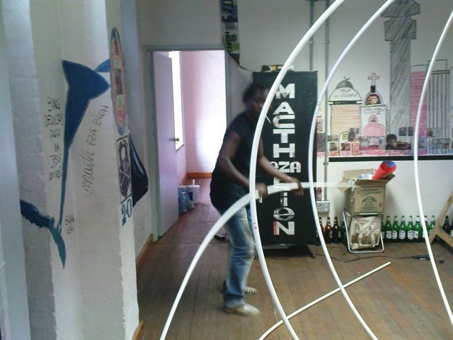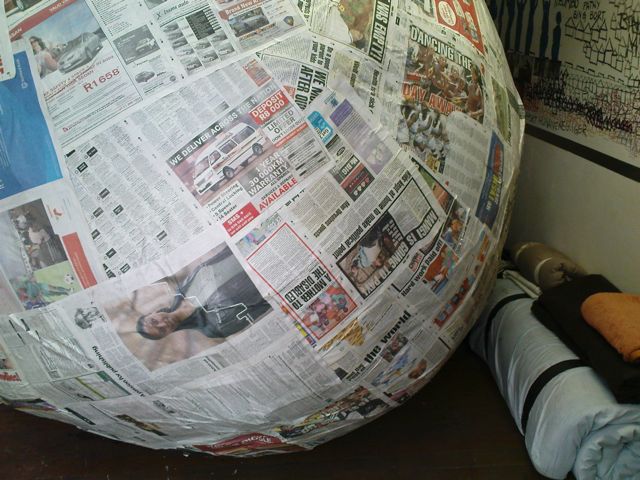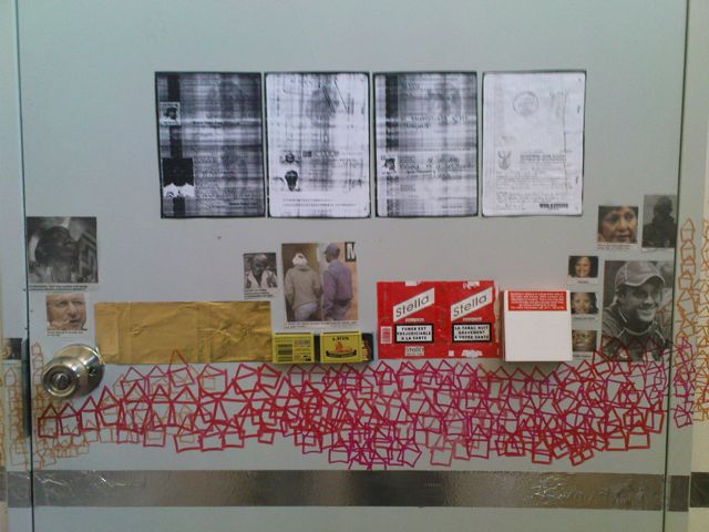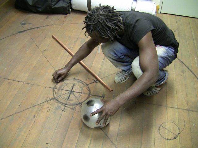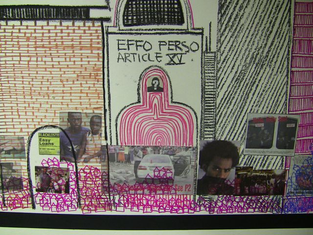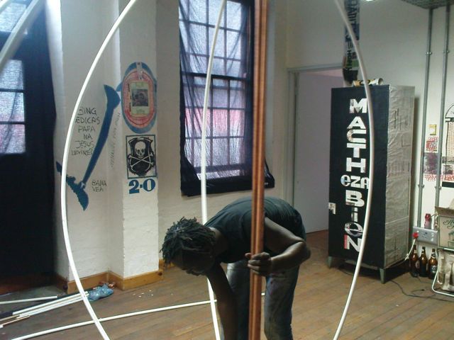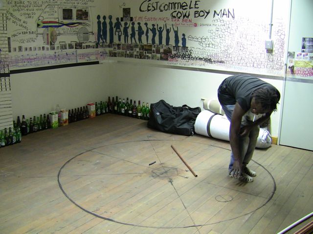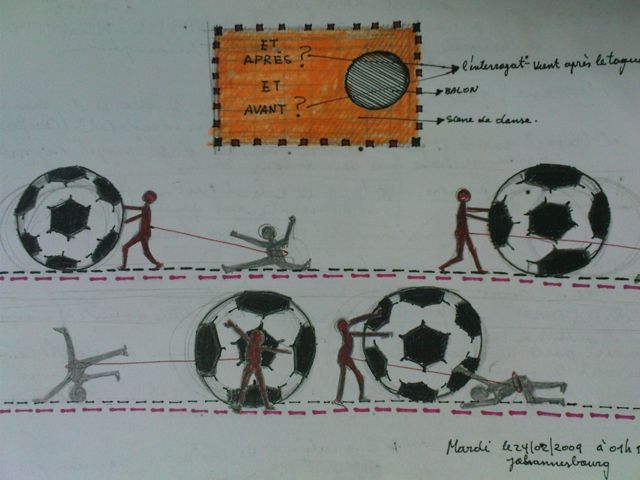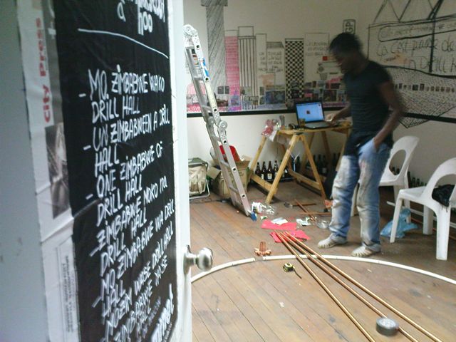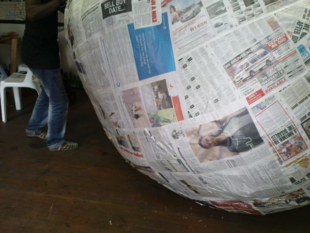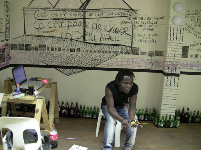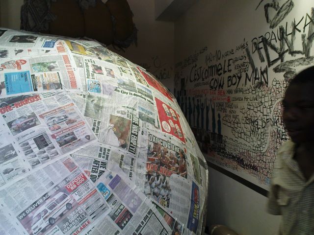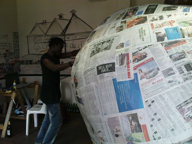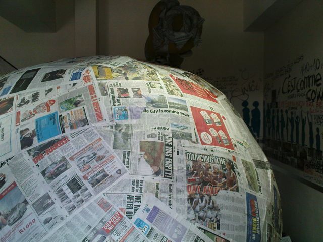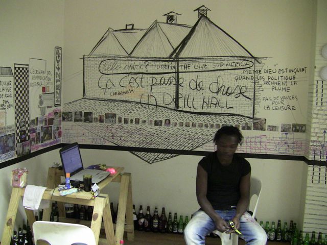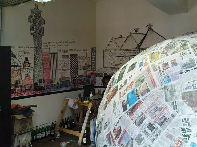 Mega Mingiedi worked obsessively in his room at the Drill Hall, slowly turning it into a wall drawing/installation, “Lelo Awa”, which commented on the outside world (the project in it’s first version was for outside, and within one night he turned it in an inside project), experiences and impressions gathered during his stay. Drawing on his interest in soccer and the impact of the World Cup, the installation included the construction of a large ball, which was covered in newspaper articles and played with the volume of the rooms dimensions. Mingiedi distilled extracts from this diary-like treatment of the walls (both commentary and record) into 3 drawings which were displayed during the Art Fair.