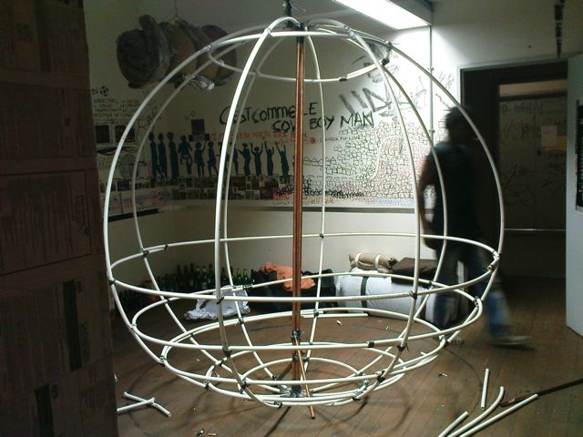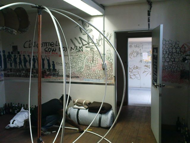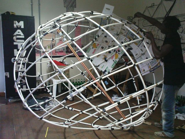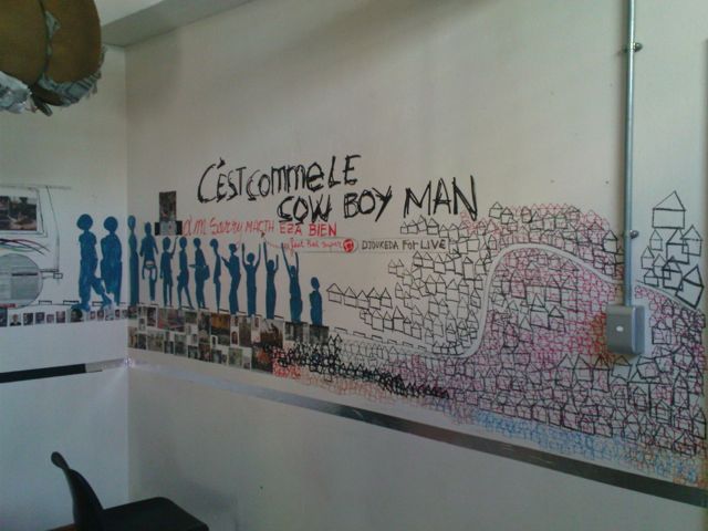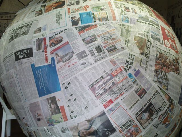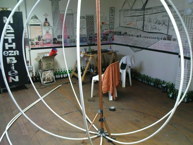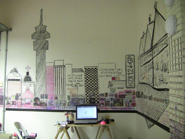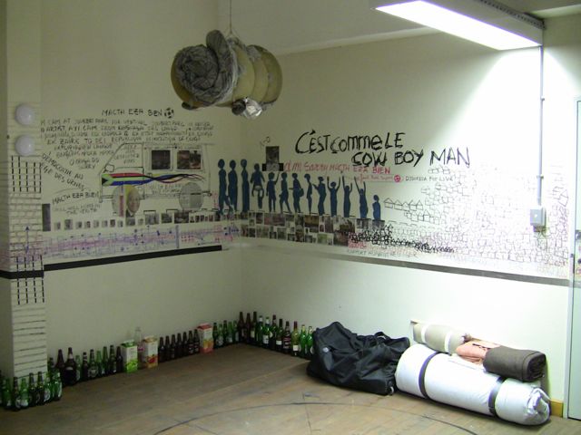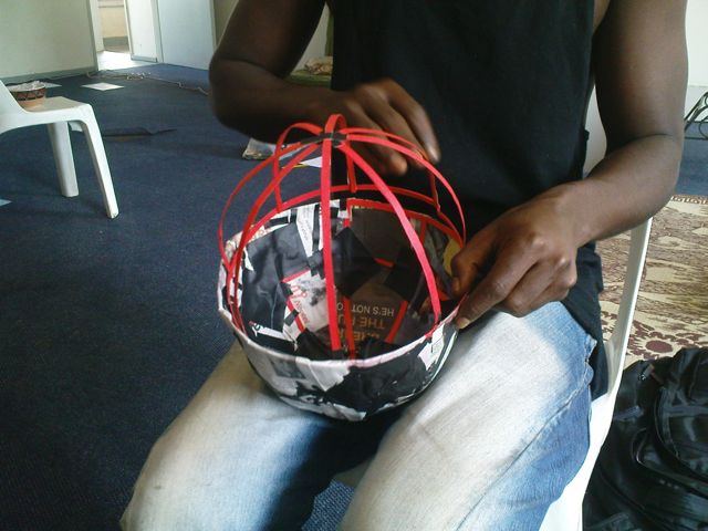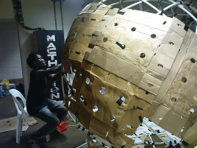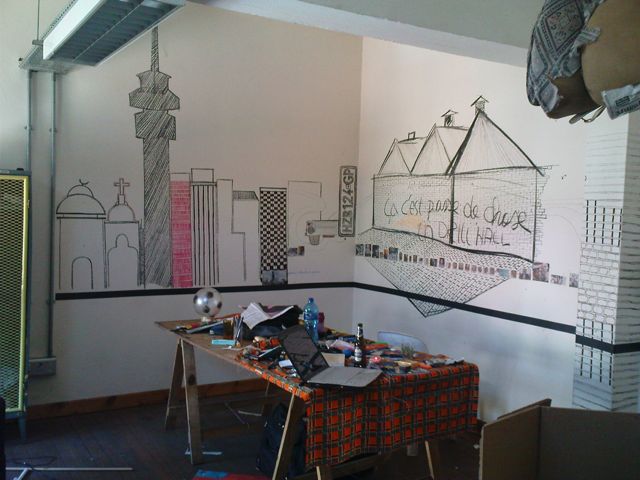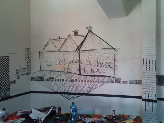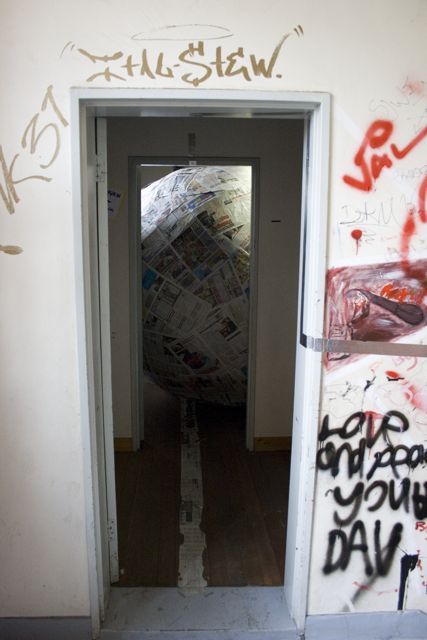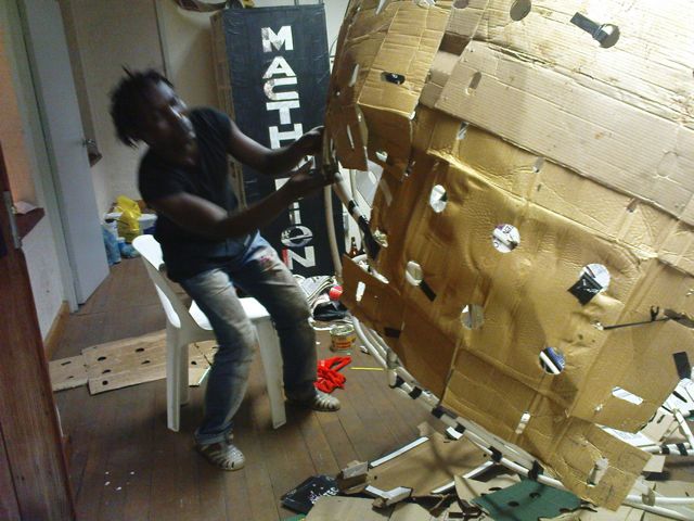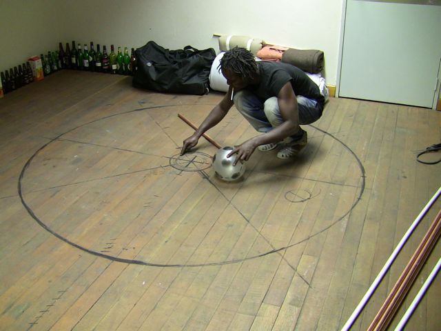 Mega Mingiedi worked obsessively in his room at the Drill Hall, slowly turning it into a wall drawing/installation, “Lelo Awa”, which commented on the outside world (the project in it’s first version was for outside, and within one night he turned it in an inside project), experiences and impressions gathered during his stay. Drawing on his interest in soccer and the impact of the World Cup, the installation included the construction of a large ball, which was covered in newspaper articles and played with the volume of the rooms dimensions. Mingiedi distilled extracts from this diary-like treatment of the walls (both commentary and record) into 3 drawings which were displayed during the Art Fair.
