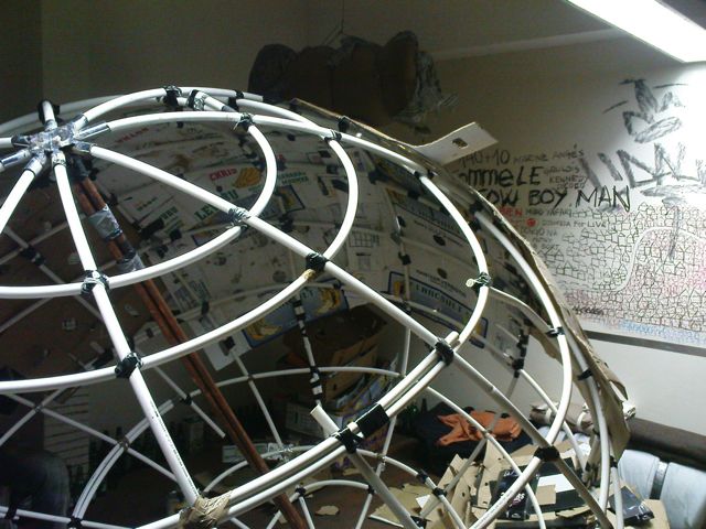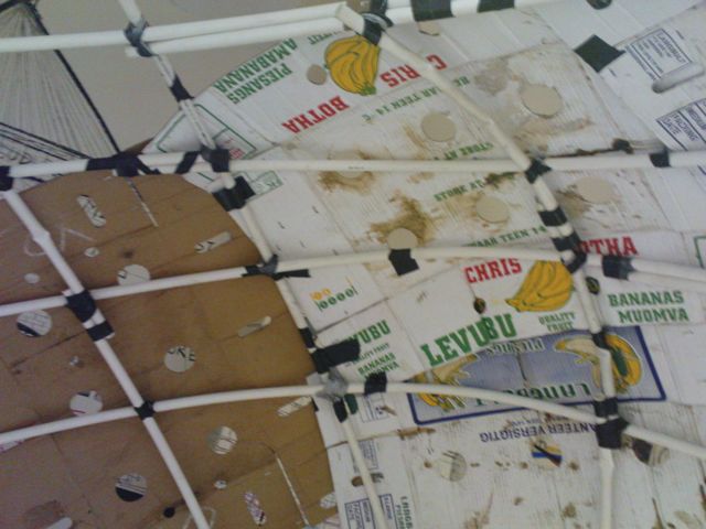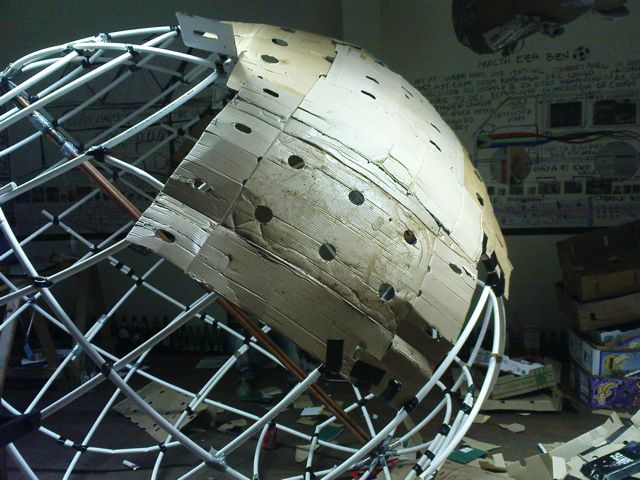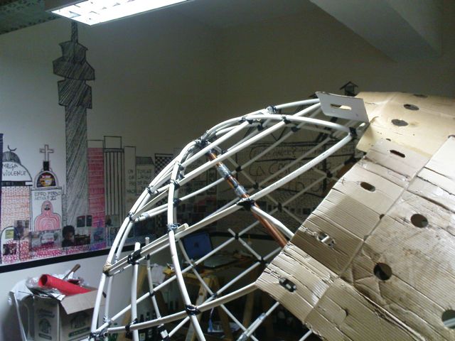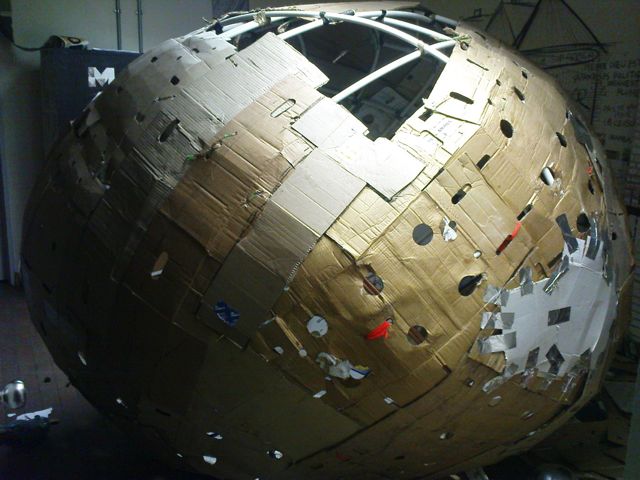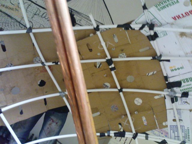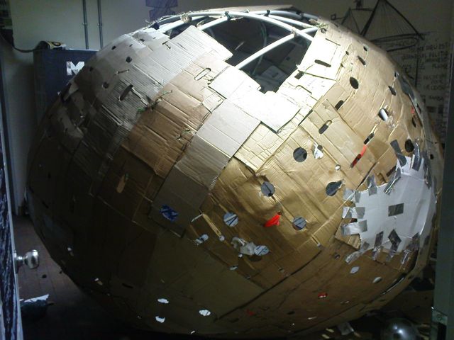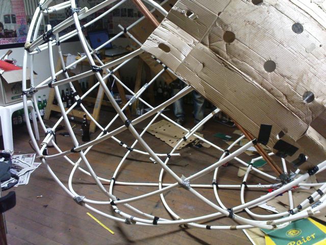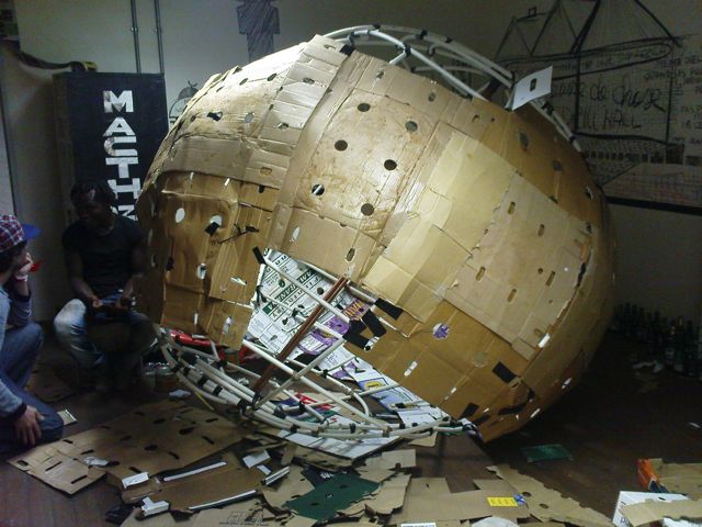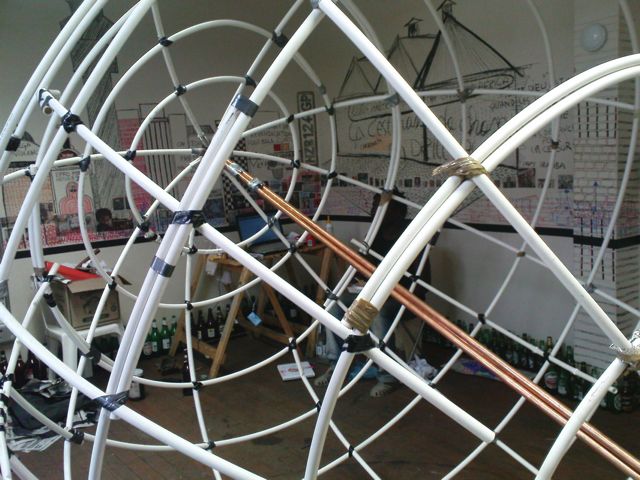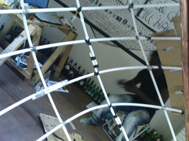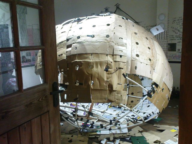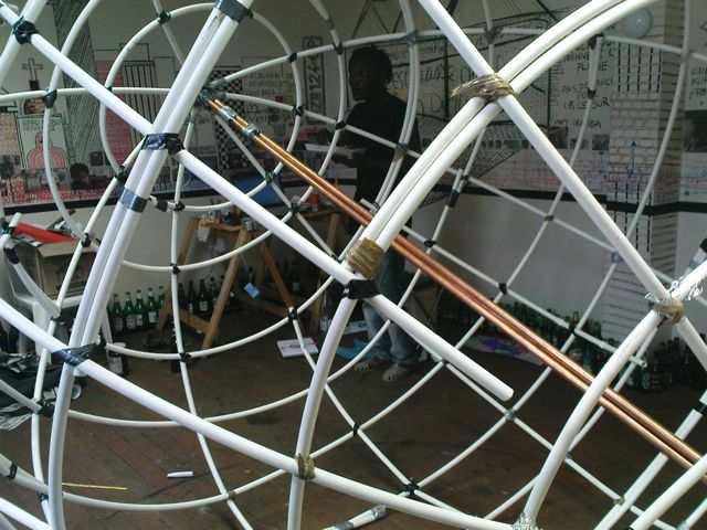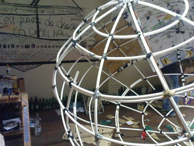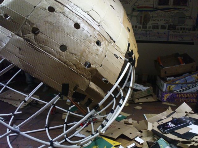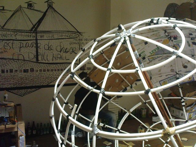 Mega Mingiedi worked obsessively in his room at the Drill Hall, slowly turning it into a wall drawing/installation, “Lelo Awa”, which commented on the outside world (the project in it’s first version was for outside, and within one night he turned it in an inside project), experiences and impressions gathered during his stay. Drawing on his interest in soccer and the impact of the World Cup, the installation included the construction of a large ball, which was covered in newspaper articles and played with the volume of the rooms dimensions. Mingiedi distilled extracts from this diary-like treatment of the walls (both commentary and record) into 3 drawings which were displayed during the Art Fair.