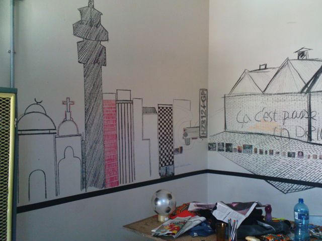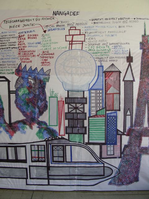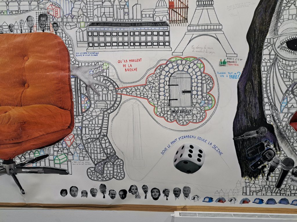 In contrast, Paris is represented differently: not as a map, but through symbolic places and fragments of precarious life. For instance, Mega Mingiedi draws the entire RER B line in the background, as it leads to Paris-Charles de Gaulle Airport, and thus, to the whole world. While the City of Light may symbolize promise for some, here it appears compartmentalized, bureaucratic, and filled with both visible and invisible barriers.