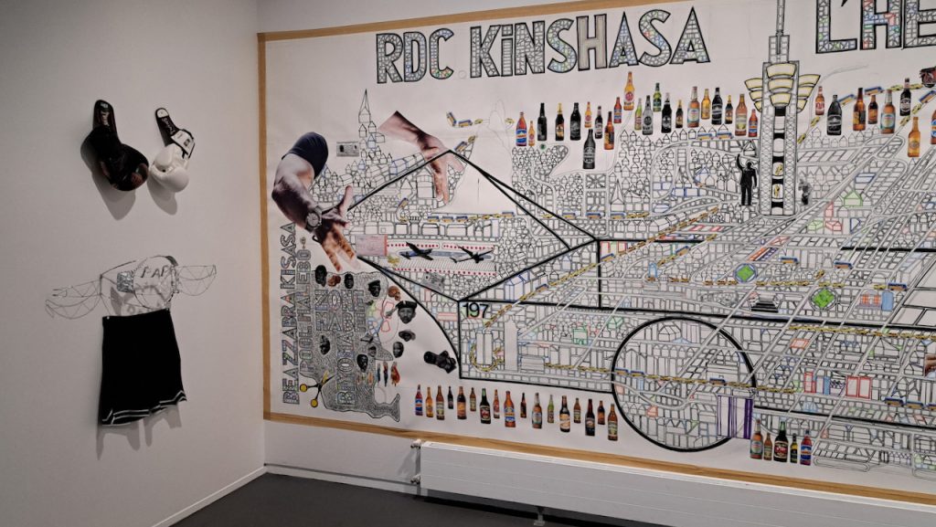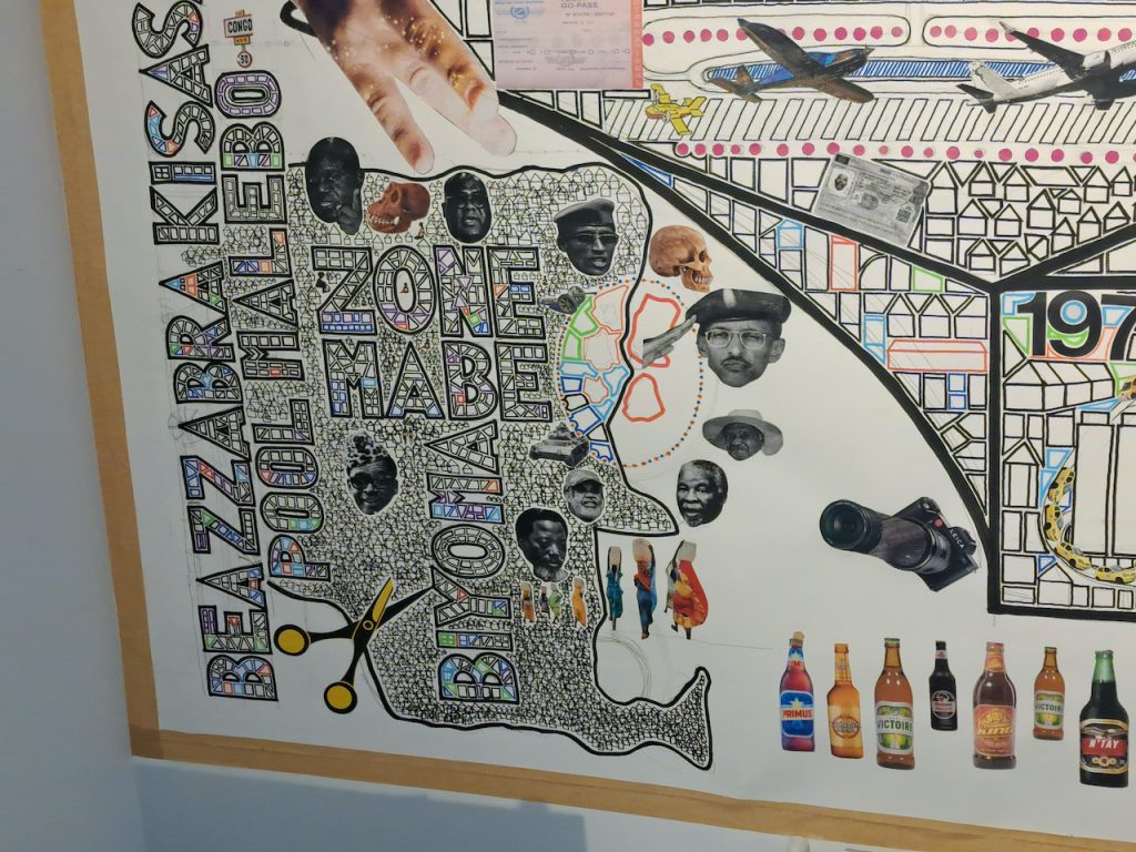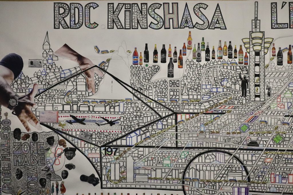 Au centre, le pousse-pousse incarne Kinshasa : à la fois outil de débrouille, vestige colonial belge et symbole d’un système économique précaire. La ville est figurée comme un cœur battant, saturé de flux, marqué par l’absence de l’État et les exils forcés. Autour se déploient des figures politiques de la République démocratique du Congo, des papiers d’asile rejetés, et des objets du quotidien révélant une critique sociale acérée. Parmi ces derniers, l’artiste choisit d’encercler la ville de Kinshasa par des collages de bière car celle-ci vient de l’héritage belge et traduit une véritable volonté politique : “donnez-leur la bière, ils ne vont plus réfléchir”.