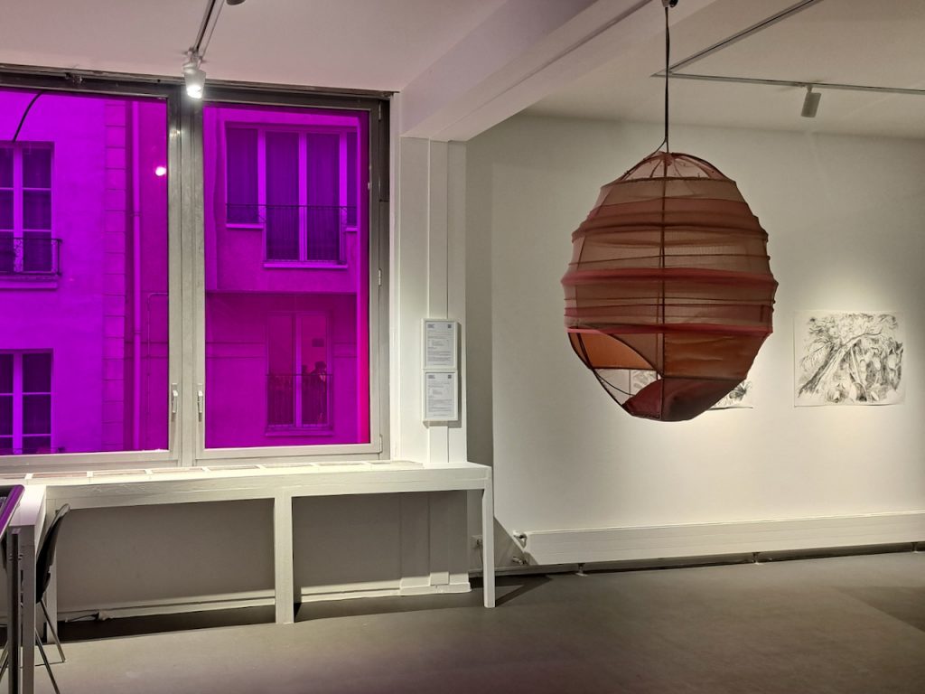 Nathalie Harb conceived a suspended object-sculpture, between a bundle and a nest, hung from trees facing the Cité des Arts building. Using a pulley system, it can be lowered to eye level, inviting visitors to rest their head on a cushion and listen to the sound piece by Youmna Saba.