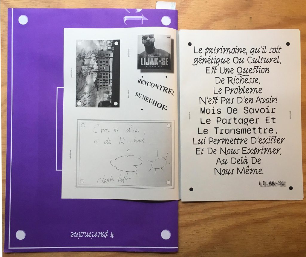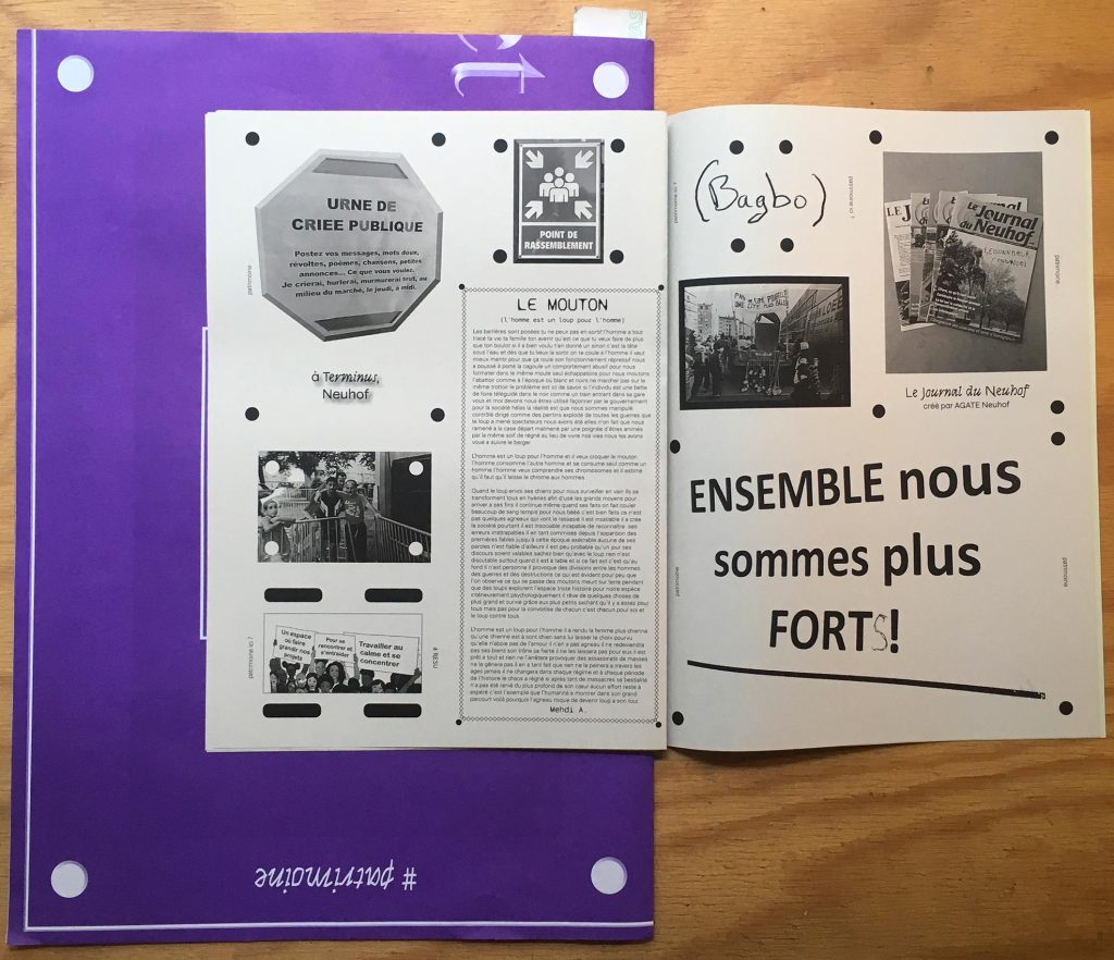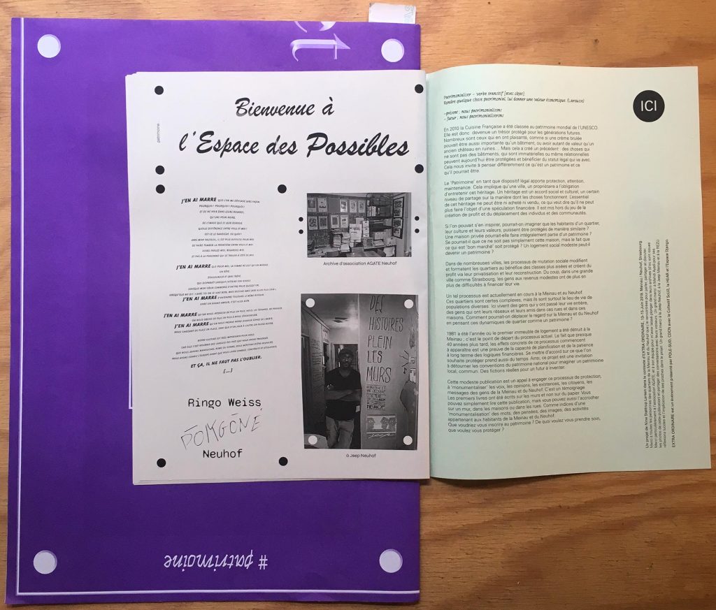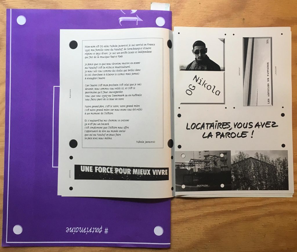 Nina Støttrup Larsen observe la manière dont certains quartiers sont en train de changer et comment cela transforme la vie des habitants. Artiste visuelle et graphiste, elle s’est appuyée sur les activités réelles des habitants du Neuhof et de la Meinau pour réaliser des objets singuliers de communication ainsi qu’une publication. L’actualité, le quotidien, les évènements locaux font les bonnes pages de ce nouveau petit journal, qui en restitue la vie de chaque jour avec aussi ses potins et ses petites annonces. Les échos du quartier passent par la voix de ses habitants que l’artiste vient à interroger de différentes façons, entre autres sur ce qui fait l’identité du lieu qu’ils habitent.