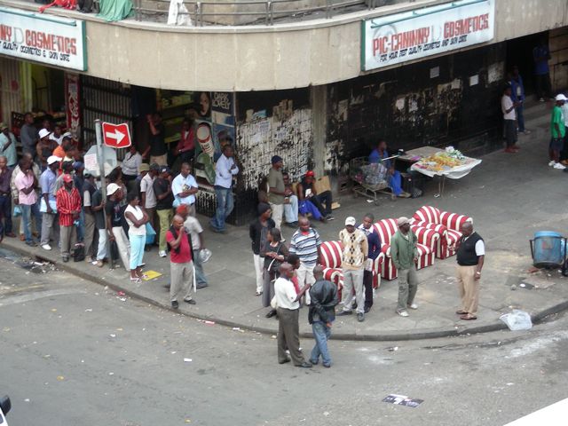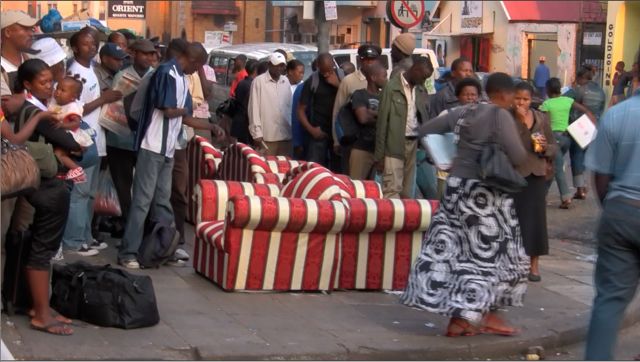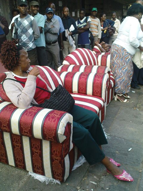 Pathy Tshindele installed  a set of coaches in different public spaces, such as the taxi rank opposite from the Drill Hall. The couches were turned into ‘instruments’ by inserting hooters underneath the seats, which were be activated each time someone sat on the couch. Installed as a domestic setting on the street in the afternoons, when commuters would wait for communal taxies, the coaches offered slapstick/Vaudevillian distraction to a scene that takes place every day in the same fashion. The coaches were installed every afternoon during the festival.