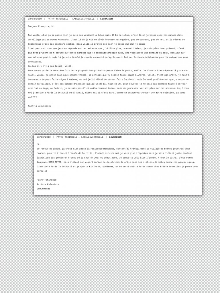 Pathy n’est pas intervenu en tant qu’artiste durant la résidence. Il s’est surtout occupé de son bon fonctionnement. Il avait cependant un projet, qu’il n’a pas mis en oeuvre. Il s’agissait d’emballer avec du papier, la totalité des sculptures, pour la plupart en béton, qui se trouvent dans le parc de l’ABA. Il y en a des dizaines, qui représentent des soldats, des mères allaitant, des hommes souffrant, etc… Elle sont le plus pur fruit de l’académisme à la congolaise. Mais il n’est pas sûr que tout le monde aurait compris qu’emballer c’est aussi en un sens donner à voir.