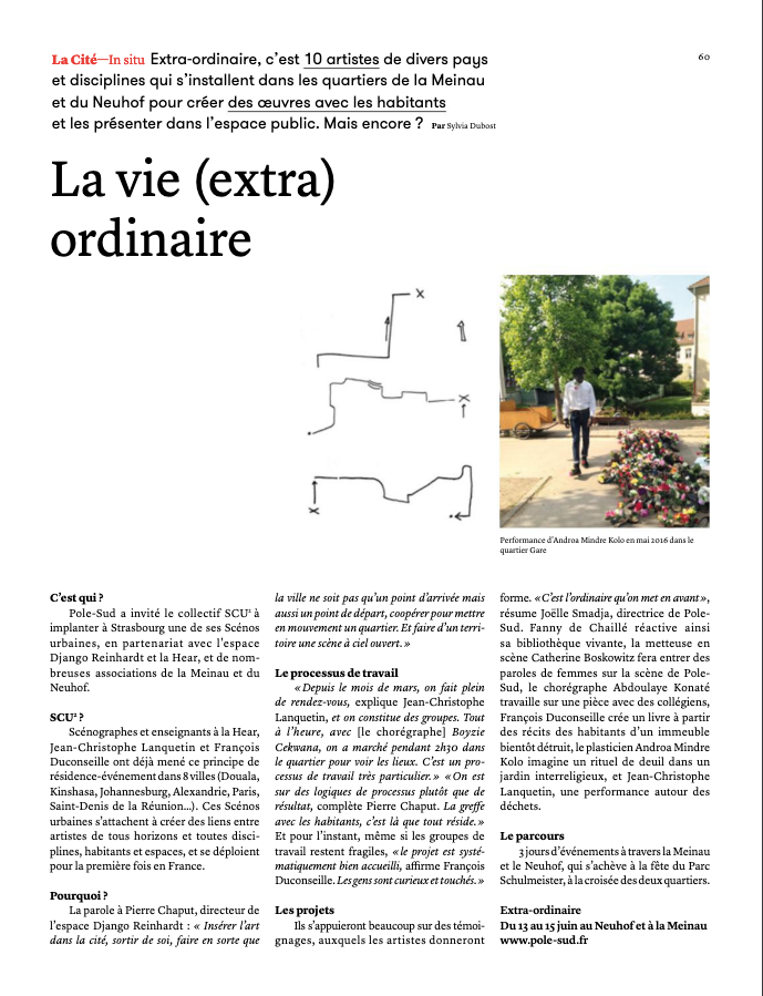 Le projet EXTRA ORDINAIRE est né d’une invitation faite par POLE-SUD CDCN au collectif ScU2. Deux autres partenaires se joignent ensuite à ce tandem pour réaliser ce projet, l’Espace Django au Neuhof, et la HEAR (Haute école des arts du Rhin).