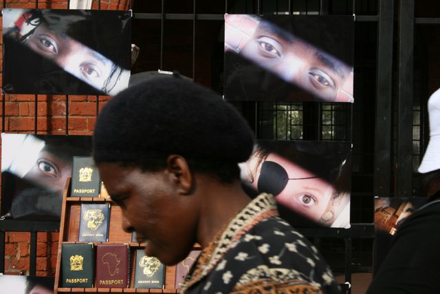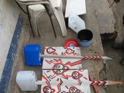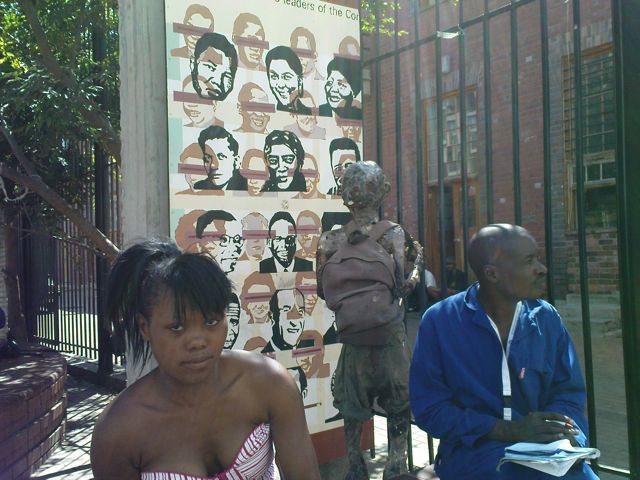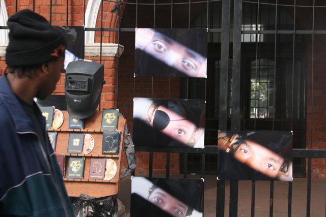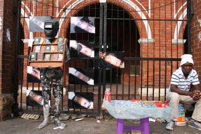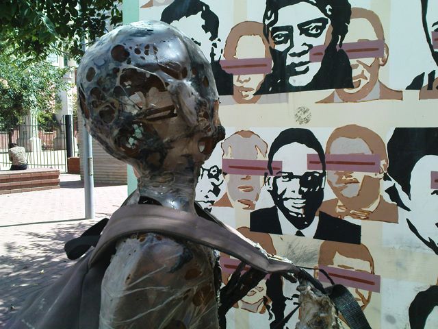 Tshime Kalumbwa conducted a series of public ‘interventions’ in the project area, working with one of the sculptures he has been working on for the last two years. Kalumbwa installed the figure, which resembles a burned mannequin, next to shops, at markets and in the street, at times adding photographs of eyes on a wall opposite from the sculpture, at time dressing the figure with clothes bought in the street. The work inspired many questions, with Kalumbwa relying on an assistant (Mbuso Karimbwe) to translate. Concern about who the figure represented (it should ‘be in a museum’), its’ threatening silence and disturbing appearance led to a number of interactions that Kalumbwe was looking for, as they addressed his own questions around the status, visibility and role of the artist/sculpture and the public.