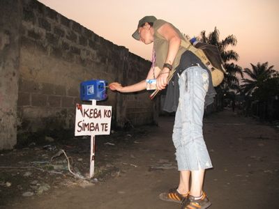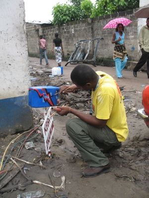 Tshime est un jeune sculpteur de Lubmubashi. Il a notamment travaillé avec Dorothée Kreutzfeldt une installation / signalétique éphémère des multiples dangers que représentent dans le quartier les installations électriques précaires et les câbles plus ou moins à nu qui parcourent les rues et l’espace urbain. Tshime a également réalisé plusieurs performances autour du « délestage », pratique très courante à Kinshasa qui consiste en cas de pénurie à priver d’électricité des quartiers entiers, parfois pendant plusieurs jours, voire semaines…