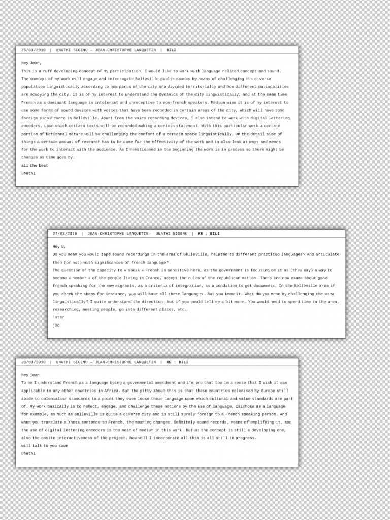ScU2 a développé un processus au long cours avec Unathi Sigenu, artiste basé à Capetown (Afrique du Sud) et co-fondateur de Gugulective, un collectif intervenant principalement à Gugulethu. Le principe de cette résidence est une série d’interventions d’artiste dans l’espace urbain de Belleville, le quartier où est implanté ScU2. Ces interventions auront lieu en lien avec la galerie « Frichez nous la paix ». Et Unathi Sigenu participera à certains projets menés par ScU2 dans le quartier (en préparation, un événement en partenariat avec la Maison des Métallos, en juin-juillet 2012). Les interventions d’Unathi Sigenu s’inscriront en lien avec les deux saisons organisées par l’Institut Français, la saison française en Afrique du Sud (2012) et la saison sud africaine en France (2013).