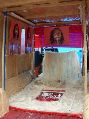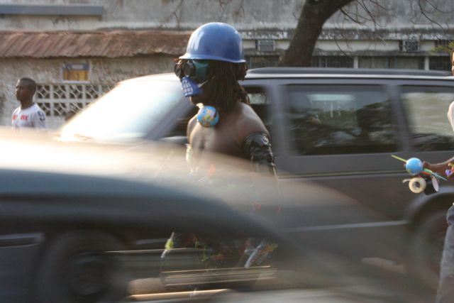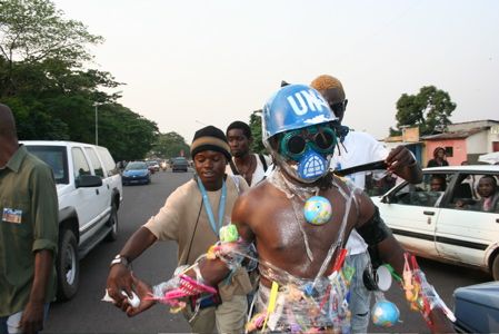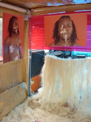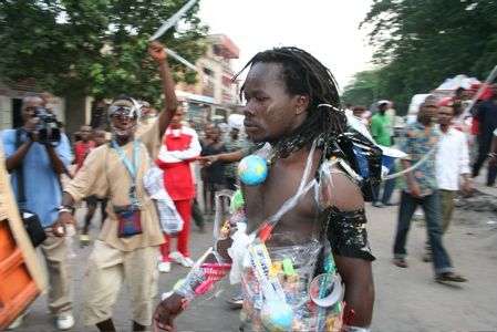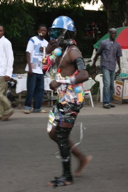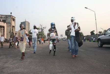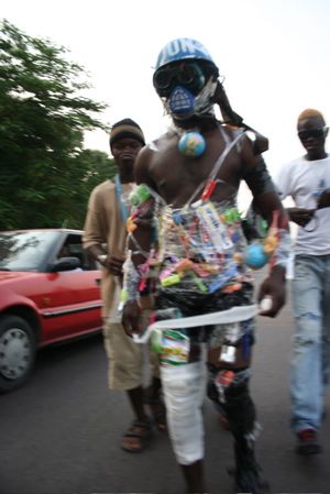 Vitshois a fait une performance sur 24. Il est parti, quasi nu, du rond point Mandela (carrefour avec le boulvard du 30 juin) et a marché au milieu de l’avenue, en se scootchant des objets usuels récupérés, des objets de consommation. Il a ainsi marché, se heurtant aux voitures, scootchant des objets sur les capots, puis il est revenu jusque devant l’Académie et s’est assis dans une camionnette qu’il avait aménagé en installation.
