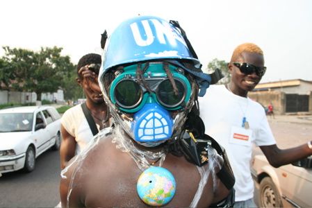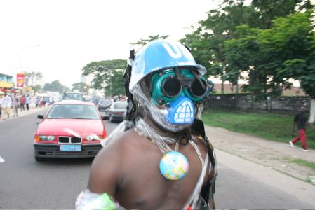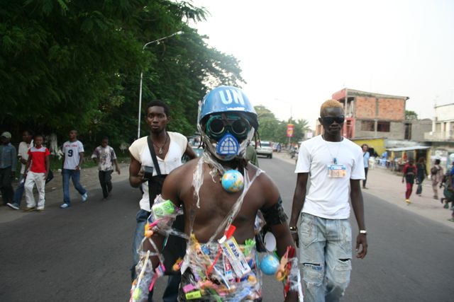 Vitshois dit ceci de son travail : « Depuis un temps je me suis investi et posé des questions : sur mon être, ma société, mon travail et la forme qu’elle doit prendre sans contrainte. J’essaye de faire que ma démarche soit un dialogue qui interroge, provoque, qui dénonce et interpelle le public et essaye d’ouvrir toute possible remise en question sur la peinture, sculpture, performance, installation et autre forme d’art. Mes performances sont également une forme de contestation, une prise de position politique dans le fonctionnement chaotique du monde et de ses mutations. PERFORMANCE : comme réalité contemporaine et rituelle qui tant au niveau intime que social et politique d’un peuple, qui permet de dénoncer des choses. Je cherche par ailleurs à établir un rapport entre mon corps en action et le public. J’aime faire des expérimentations devant le public et poser des actes qui questionnent sur les réalités des sociétés actuelles (…). DANS CETTE PERFORMANCE à Kin (…), je cherche à dénoncer l’esprit de manipulation des grandes puissances vis à vis de mon pays (le Congo). Comment un peuple est consommé, manipulé, imposé de la liberté d’expression et d’agir. Tout est représenté par l’accumulation des objets et autres éléments de consommation sur mon corps (…) avec un casque des UN (Nations Unies)pour montrer les soldats de la paix qui jouent au détournement de leur mission pour leurs interêts propres ».